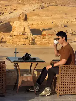 The secret to visiting one of the 7 wonders of the ancient world, Khufu Pyramid, is to choose a place to stay that is close, as close as possible. You can sit and look at the Sphinx since the sun sets. Choose to stay in the area behind the Pyramid. There will be many accommodations with a beautiful view like this. Luckily, I got to sit and watch the light, color, and sound show on the balcony in front of the room. I didn't have to buy an entrance ticket. I stayed in this area for 2 nights.