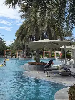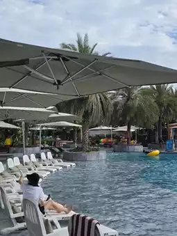 During the sunny daytime hours, the main pool is filled with a bright and warm atmosphere. Thanks to its open design, there are no shaded areas, allowing guests to fully enjoy the sunlight. The pool features a consistent depth and spacious layout, making it ideal for swimming. With ample space between people, it’s perfect for quiet conversations or spending time alone. The signature tranquil ambiance of Mövenpick Resort ensures a peaceful experience without any hustle and bustle. The water is meticulously maintained, offering a refreshing and clean environment at all times. The harmonious blend of the sky, the pool, and the distant trees creates a picturesque view. This is an ideal spot for travelers seeking effortless relaxation.