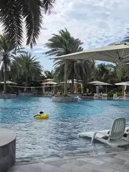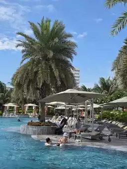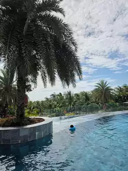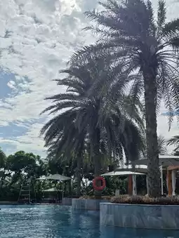 The communal swimming pool at Mövenpick Resort offers a different ambiance depending on the time of day. Particularly during mid-morning or late afternoon, when children are dispersed to the kids' pool, the main pool becomes a tranquil haven. Only a few adult guests occasionally use the main pool, allowing for a truly peaceful retreat. The space is so serene that encounters with others while swimming are rare. The sunlight is warm, the water ripples gently, and conversations from nearby loungers are barely audible. During these hours, the atmosphere is so soothing that no background music is necessary. Surrounded by trees and grass, the pool area exudes a sense of being immersed in nature. Guests can also enjoy the poolside service, which provides towels and beverages, without any hassle. If you’re seeking undisturbed relaxation, the communal pool during these times is the perfect choice.