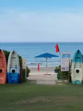 The resort's tranquil surroundings, with the gentle sound of lapping waves providing a backdrop throughout the day, offer a truly relaxing experience. In the evenings, guests can stroll along the long stretch of beach, enjoy the cool sea breeze, or sip a drink at the poolside bar, where soft lighting and live music create the perfect romantic atmosphere.