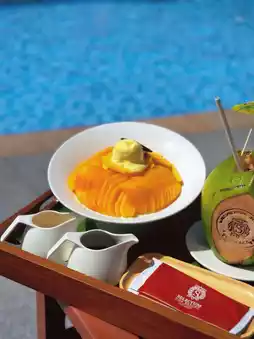 While enjoying a relaxing staycation at this resort-style destination with delicious food, you can also quietly indulge in the hotel pool while savoring mango shaved ice. Guests can access the private beach, coconut garden, and infinity pool in the villa area, providing a variety of water activities 💦.