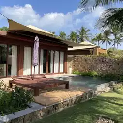The interior is also comfortable with wood colors and mint base, and it is made up of pool villas, so you can play in the pool villas privately!