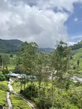 Endless Tea Fields + European-Style Tea Factory Architecture: The paths are flanked by neatly arranged tea trees, offering expansive views. In the middle, you can spot the nostalgic factory rooftops, which, combined with the blue skies and white clouds, create a picturesque frame. 📷