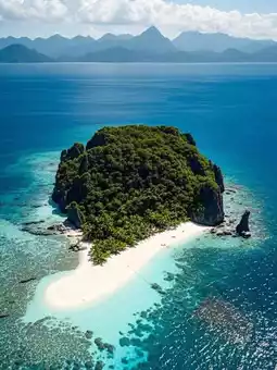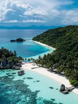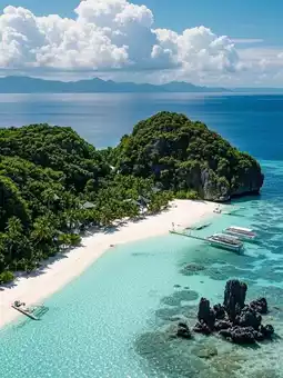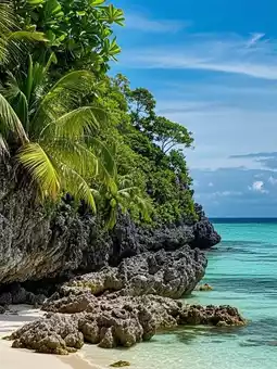 Upon arrival at Camiguin Island, we are greeted by a picturesque coastline. The white, delicate sandy beach, kissed by the sun, shimmers with a golden glow, as if nature has scattered pieces of gold across the land. Gentle waves roll in, softly caressing the beach, creating a pleasant sound, like a melodious lullaby. The distant sea, as blue as a gemstone, merges with the sky, creating a dreamlike horizon where it's hard to distinguish between sea and sky.