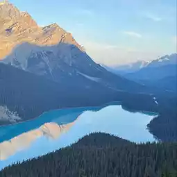 The first is "Peyto Lake." When viewed from above, it resembles the shape of a cute "fox's head." Its glacier-fed waters carry rock flour, giving the lake a stunning translucent ice-blue hue❄️. From the viewpoint, you can gaze upon the entire lake surrounded by snow-capped mountains and lush forests—a breathtaking sight you won't want to look away from.