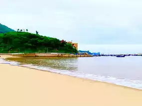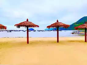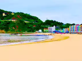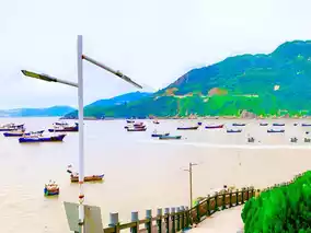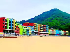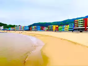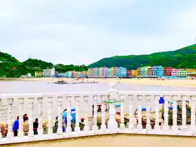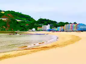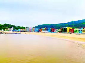The golden beach of Wenzhou Yanting scenic area, connected to a colorful town. Colorful houses, paths through the square, the end of the road is the sea. The beach stretches for several kilometers, the sand is delicate, and the sea water is clear. On the edge of the curved beach, there are colorful villas scattered. There are fishing boats on the sea. By the roadside of Chongjia'ao, let us go to the mountains and the sea together.