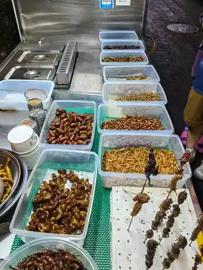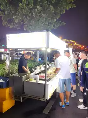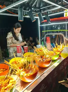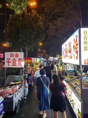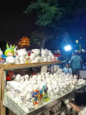 Took a taxi to Qingfeng Tower, and the stalls on the bridge opposite stretched as far as the eye could see. There were all kinds of food, even insects.