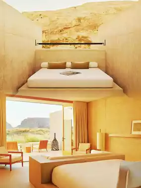 The main body of the hotel is located next to the low opening of the sandstone strata, and it looks like an ancient human settlement from a distance. Each room can appreciate the original and pure natural beauty of the surrounding mesas, and the fascinating changes of natural light throughout the day.