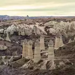 Cappadocia is a region located in central Turkey (Turkey). The highlight is the unique landscape, full of strangely shaped rocks caused by past volcanic eruptions. 🌋
