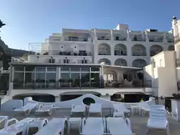 Hotel Stay: We checked into Hotel La Residenza, which features stunning Greek-style architecture. The hotel has a small pool overlooking the sea and plenty of sun loungers for relaxation. When we entered our room, we discovered a spacious L-shaped balcony—what a treat!