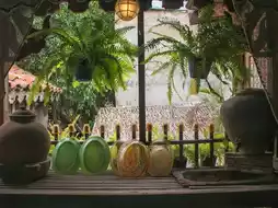 Note that the structure is built from a mixture of wood and coral stones, with red tiles making up the curved roof. Enjoy the green ambiance generated by the potted plants flanking the entrance walkway.