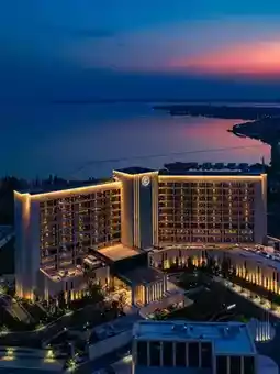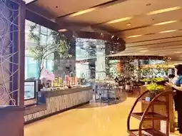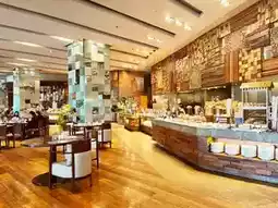 The main dining area "Feria," located within the hotel, is an open and inviting buffet restaurant featuring a glass-walled design.