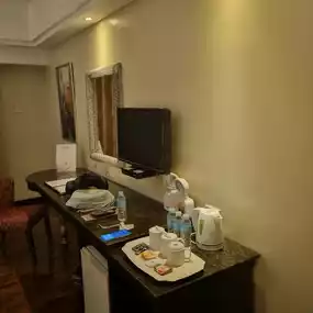 The room was clean, with three beds. It was a bit awkward to open three suitcases, but there were three bottles of water, coffee, and tea. There were disposable slippers for indoor use, but there were no bathrobes.