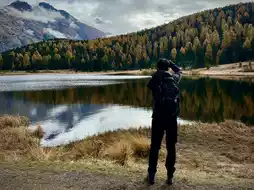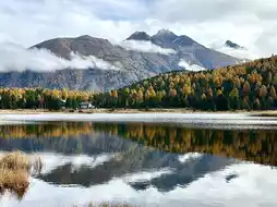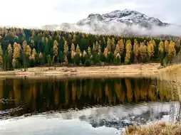 So, by the end of October, the leaves turn a golden color, reflecting off the surface of Lej da Staz, earning it the nickname "Mirror Lake." It creates beautiful and impressive scenery.