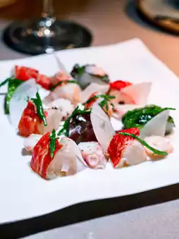 The salad features blue lobster, octopus, and scallop sashimi wrapped in seaweed, with the lobster served semi-cooked, fresh and bouncy✨ Paired with radish, sea asparagus, lime juice, and roasted peanut oil, this appetizer is tangy and appetizing☺️