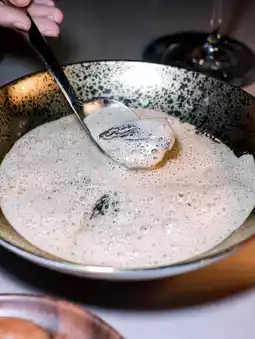 Generously shaved fresh black truffle slices😍 The surface is covered with black truffle slices, while the base consists of potato cubes marinated in wine vinegar and truffle juice, crispy potato chips, and truffle foam, offering a creamy and layered taste👍🏻
