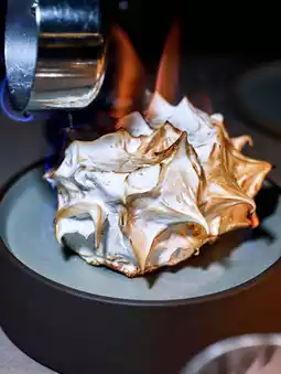 The staff pours flaming orange liqueur over the ice cream cake, lightly toasting the meringue exterior, making it sweet and fluffy✨ Inside, there are three layers of ice cream and cake base, including vanilla ice cream, raspberry sorbet, and chocolate ice cream😍 The tangy raspberry sorbet balances the sweetness, offering a rich layered taste
