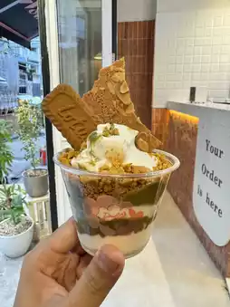 You can match it yourself, of course select the one not on the menu. I made my own "Pistachio Sauce Pistachio Crunch with Lotus Drink Dry Crunch" 😌 Pistachio Crunch + Lotus cake both have a strong crunch, plus the rich nut flavor at the bottom of the sauce, indeed done not too sweet, and very tasty! The shop also gave away a piece of almond crisp, I believe it will be great with coffee and chocolate flavor!