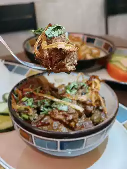 Cooked slowly for five hours, this method elevates the texture of the originally marbled and firm Kala beef 🐂 The beef is marinated with spices, tender yet substantial.