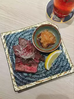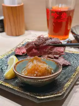 Salt-grilled beef diaphragm meat with carrot puree kumquat vinegar 🥩 single order $ 188 💰 diaphragm meat half-cooked 🐄 The meat is pink and tender, beef flavor is heavy 😛 with shredded onion, then dipped in carrot puree kumquat vinegar or lemon juice 🥕🍋 is very good 👍🏻