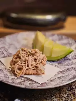 The meal concludes with a warm bowl of red clam miso soup and desserts of single-wave chestnut and Shizuoka melon, providing a perfect ending to this chef-curated experience. The entire meal is a feast for both the eyes and the taste buds, leaving an unforgettable impression.