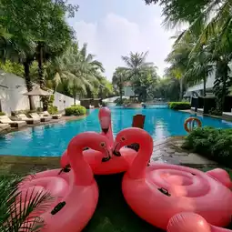 The swimming pool of the DoubleTree by Hilton Hotel Jakarta is located on the first floor, right next to the breakfast area. The swimming pool itself is really large and has 3 beautiful floats that you can use to float and relax.