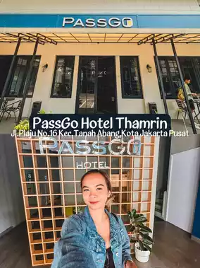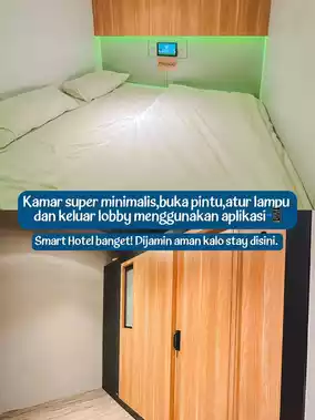 #hotelreview I want to share one of my recommendations for affordable capsule hotels in Jakarta! The hotel is super cute and accessible through an app. As soon as we entered the lobby, we were greeted by a super minimalist and aesthetic lobby with blue and white hues.