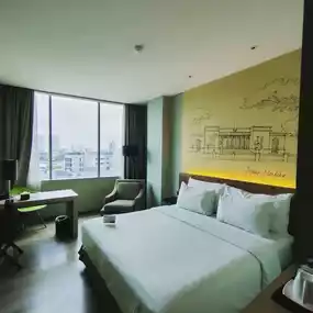 Deluxe Type Room with a size of 24m² and there is a work desk and sofa which is quite spacious. With a view of the Capital City building and there is a room area with a Monas view. Cleanliness is quite good and a plus for me there are hotel speakers that play songs that can break the silence when we are in the hallway.