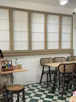 The shop is decorated in white tones, simple and clean, with small trees in the corners, looking warmly minimalist. There are a lot of seats, open, airy, not stuffy at all, very clean, like a small cafe that serves jok instead of coffee.