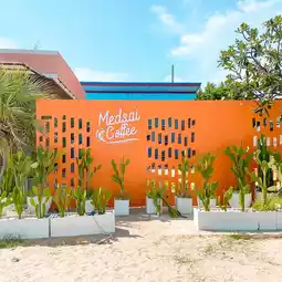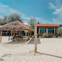 Bright orange cafe on a white beach by the sea