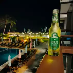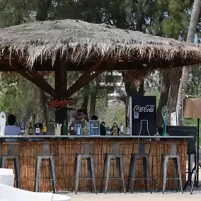 Outside the hotel is a wide beach. You can see the beautiful sea. There are people riding horses for us to take pictures with the beautiful sea (but you have to pay). There is a bar on the beach with a table to sit and relax at both day and night. The bar closes at 11 pm.