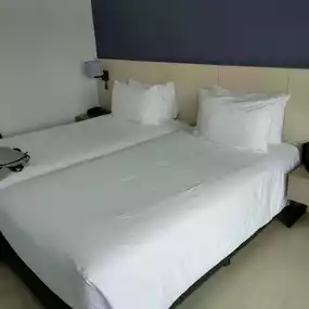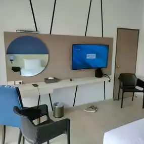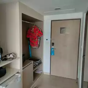 The room is quite spacious. There is a security system as a key card. The bathroom is very large. The wet and dry areas are clearly separated. The room has 2 beds, 3.5 feet. There are power plugs everywhere. There are USB ports. There is a built-in work desk with a 55" TV, a large mirror, a coffee maker, a small refrigerator, a clothes rack, a safe, and a balcony for sitting and breathing fresh air. The room we got has a door connecting to another room if you come as a family.