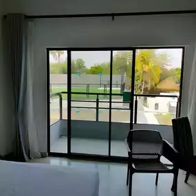 The hotel has been renovated. There are 2 main buildings, both buildings have 4 floors. The first building will have a view of the parking lot. The other building will have a view of the swimming pool and the sea. There are 2 swimming pools here. The first pool is a shared pool in the middle with a slide. The other pool is at the back of the building. It is a long private pool. If anyone books a room on the 1st floor, the back of the room can be the back door of the room and you can swim right away.