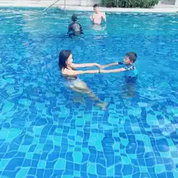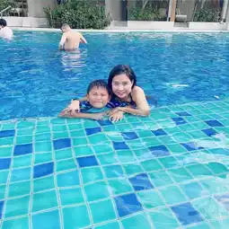 The family-style swimming pool is packed with guests due to the long holiday weekend. Enjoying cake with your family and using the pool is another way to have fun. 😍
