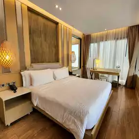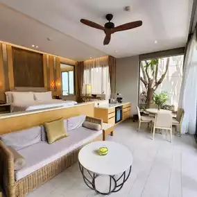 Villa: It is divided into a living room with stairs to walk down. There will be a sofa with a dining table, a mini bar and a bedroom with a King Size bed and a work desk.