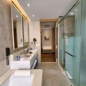 🛁 Bathroom: Not very large, but well-proportioned, with a bathtub. There is a mirror that can be seen from the bed.