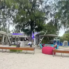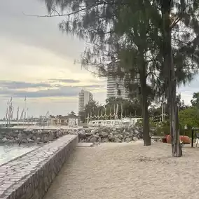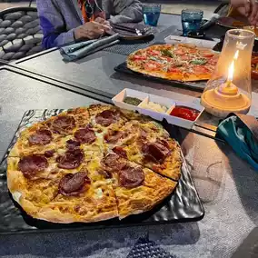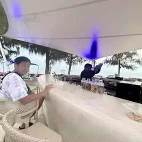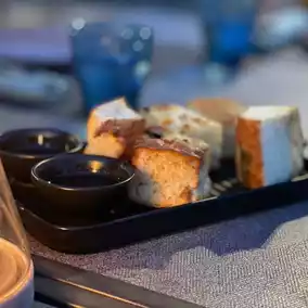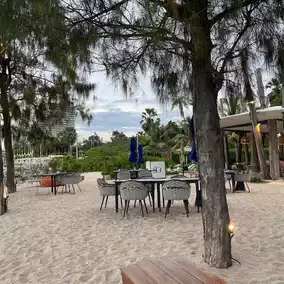 Western-style restaurant in So/Sofitel Hua Hin Hotel. It is a restaurant by the sea. The evening atmosphere under the moonlight. Here, the food is Italian style. We ordered pizza and Japanese potatoes. While waiting, they will give us some bread, not sure what kind, but it is soft and very delicious. The taste of the pizza is that the dough is crispy, fragrant with spices, delicious, lots of cheese, the atmosphere is excellent. There is also a bar to order drinks. It's very atmospheric.
