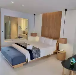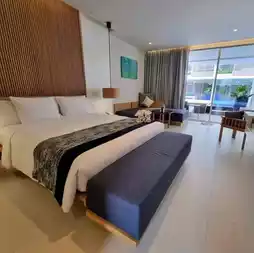 The room we chose was a Deluxe Pool Access room by the pool, allowing us to enjoy the beautiful view of the pool. The room is decorated in a modern loft style, with a bathtub inside for you to lie down and soak in. All amenities are complete. You can rest comfortably without having to go anywhere. And importantly, there is a highlight here, which is a swimming pool decorated in blue tones by the sea, where you can lie down and enjoy the sea view on your day off.