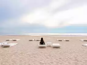 ☀️ Another corner that you can't miss in the evening. Come sit and lie down on the beach with the white bed corner that has been prepared. It's very chill, everyone. There are horses to ride as well (but this costs money).