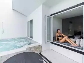 🛏️ The room we stayed in was the 𝐏𝐨𝐨𝐥 𝐒𝐮𝐢𝐭𝐞. Highly recommended for couples. The room is 84 square meters and comes with a private pool. The interior is decorated in a style The zones are very well divided. There is a bathroom area, a 𝐛𝐚𝐭𝐡𝐭𝐮𝐛 for soaking, a luggage storage room, a bedroom, a mini bar corner, a sitting area, and a balcony area.