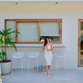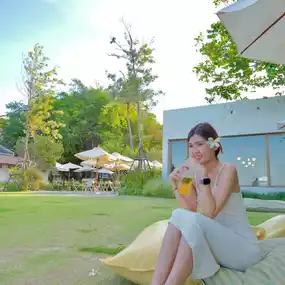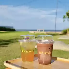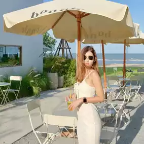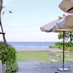 A super chill cafe right by the sea. The atmosphere is great. There are many photo spots. 📸👍 The shop is decorated in a minimalist style, with white tones, contrasted with green grass and blue sea water. It's perfect. It's even more chill in the evening. And you can also bring your pets here. 🐶 But you can only stay in the outdoor area.