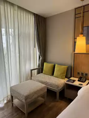The room is spacious and very comfortable to sleep in. I slept soundly and didn't wake up in the middle of the night. The air conditioner is very cool. There is a balcony for us to sit and enjoy the view of the swimming pool (if you stay on the 1st floor, some rooms will have the entrance to the swimming pool in front of the room). The room has complete amenities. We almost brought only our clothes.