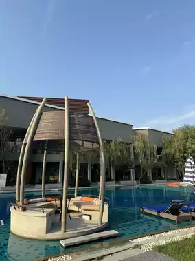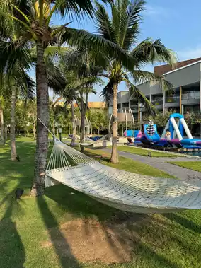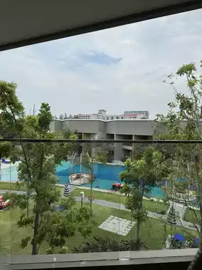 The accommodation is a 3-storey building. What I like the most is that there are trees in every part, giving a shady and cool atmosphere. When we walk around the accommodation, we don't feel too hot. The large swimming pool is in the middle between the two accommodation buildings. There is a pool area for children, water toys, and a seating area and a restaurant in the middle. Since the accommodation is not very high, some rooms are quite far away. It may be tiring to walk, but they have golf carts with staff to provide shuttle service.