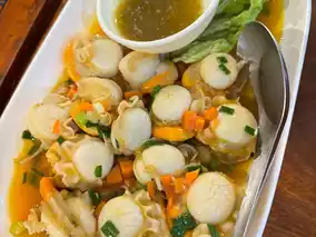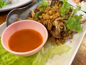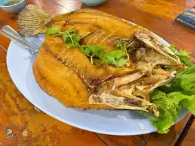 “A compact, off-the-beaten-track Cha-am restaurant that focuses on the taste and freshness of the ingredients, not the atmosphere. Here, there are shrimp, shellfish, crabs, fish, lobsters, and a variety of other dishes. I tried the "Crab Basil" which was very good. It used large crab chunks and was stir-fried dry with a strong flavor. The "Crab Omelette Roll" was recommended by the restaurant. The crab was magnificent, packed in eggs and fried to perfection. The "Squid Egg Stir-fried with Fish Sauce" was also good. The squid eggs were emphasized and stir-fried until smooth and salty and sweet. The "Clear Tom Yum with Sea Bass" was very good. The sea bass was fresh and had white meat. Tom Yum soup is sour and spicy. Impressed with this restaurant.” (by Ms. Bai Mon)