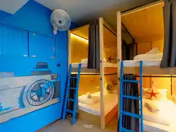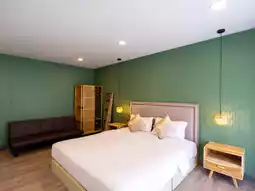 THALAY Cha-am by THA has 3 types of rooms: Dormitory, Private Room, Deluxe Pool View. There are both rooms with private bathrooms and shared bathrooms. Today we stayed in a Deluxe Pool View room, which is a 2-story room with a spacious size. The lower floor is a living room, a bathroom, and the upper floor is a bedroom.