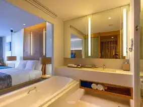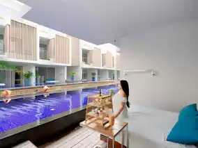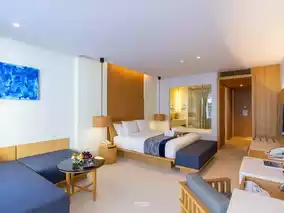 There are 118 rooms here, divided into 9 room types. Today, we stayed in the Ace Deluxe Pool Access room, which is a room where you can get into the swimming pool from your room. The decorations are in soothing colors, perfect for relaxation. There are complete facilities and a central area that is fully equipped, including a fitness center, swimming pool, wellness center, Starbucks, water activities such as kayaks and paddle boards, a beachfront restaurant ready to serve delicious food and drinks in a chill atmosphere, live music, DJs, fire baton shows, and much more.