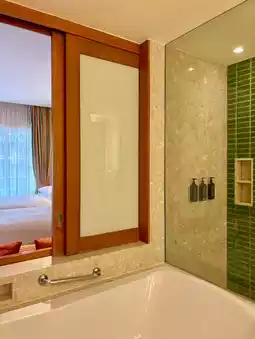 ✨The bathroom is quite spacious. There is both a shower box and a bathtub. The bathtub is also quite large. The amenity kit is complete. The soap and shampoo smell very good.