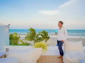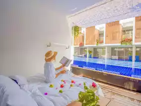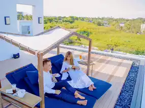 #Seaside travel #100 ways to travel Luxurious accommodation by the sea in Hua Hin with a beautiful blue swimming pool. Ace of Hua Hin Resort, a luxurious resort that looks like it's abroad, designed in white and blue tones. The swimming pool has 2 zones: in front of the room with a bed in front of the room where you can walk straight into the pool, and the seaside zone. The interior of the room is decorated in a simple, luxurious, eye-catching style with complete facilities and a sky bar zone to sit and chill while sipping a drink. There is also a restaurant that serves both Thai and European food. If you come to Hua Hin, you must stay here, you will not be disappointed. #travel #good atmosphere accommodation #Hua Hin