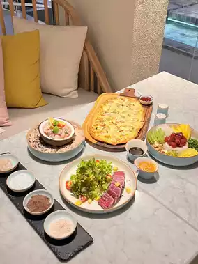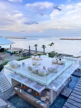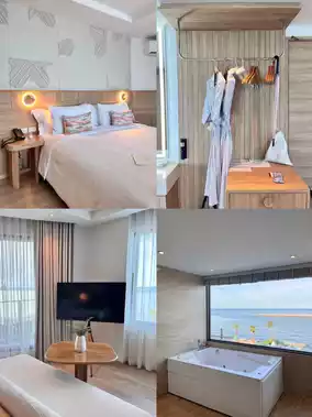 Traveling to Hua Hin, if you want to stay at a beachfront accommodation, we recommend this place, "U Hua Hin", a white minimalist style hotel, soft, with many photo spots. We stayed in a Deluxe Panoramic room, which is right on the beach. There is a large Jacuzzi to soak in while looking at the sea view. It's really great. In the evening, we recommend the HIWA KAI Kitchen restaurant, which serves Hawaiian-style food using local ingredients. We have to say that you have to come and try it. There is also a pool by the sea. The color is soft white. It is next to the Breeze Bar, which has a very chill atmosphere. If you are looking for a place to stay with a good mood and a Korean feel, we recommend this place. 📍U Hua Hin