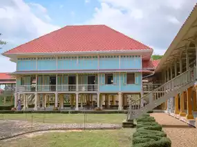 Mrigadayavan Palace is located in Phetchaburi Province. It is a beautiful golden teak palace built during the reign of King Rama VI. Its architecture is a mix of Thai and European styles. The building is located by the sea, with a peaceful atmosphere, surrounded by trees and flower gardens. It is a popular place for those who want to visit history and relax amidst nature.